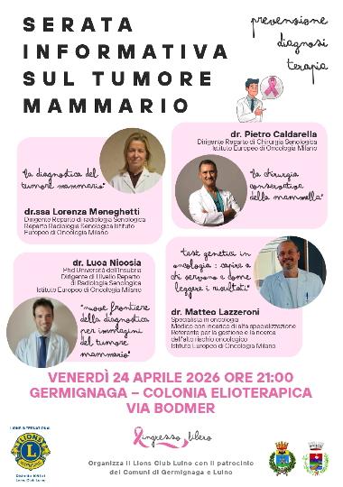 L’incontro, coordinato dalla dottoressa Lorenza Meneghetti, professionista dell'Ieo e socia del Lions Club Luino, si terrà venerdì 24 aprile 2026 alle ore 21 nella Colonia Elioterapica di Germignaga.